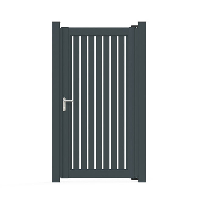 Aluminium poort met verticale spijlen vulling 80V | Mooie, robuuste tuinpoort van aluminium. Complete poort incl. vleugel, poortpalen, scharnieren en slot. Lees meer.