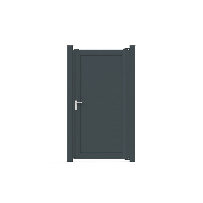 Aluminium poort met horizontale smalle tandgroef vulling | Mooie tuinpoort van aluminium. Complete poort incl. vleugel, poortpalen, scharnieren en slot. Lees meer.