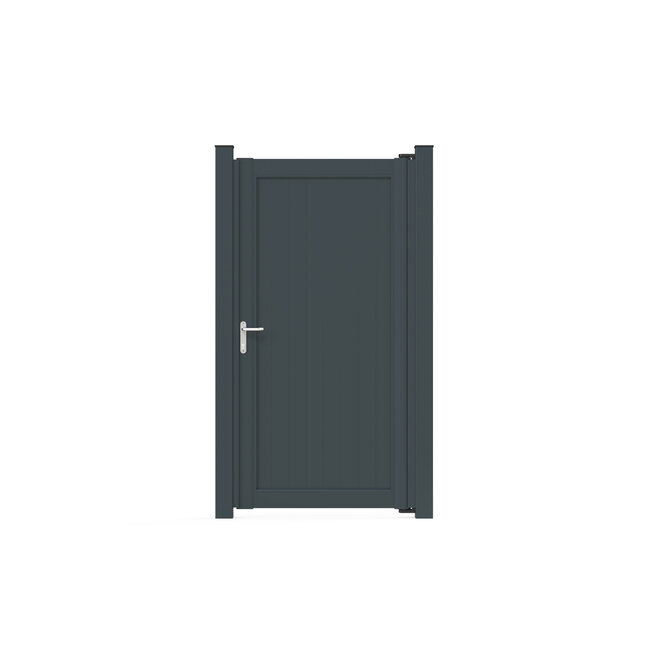 Aluminium poort met verticale smalle tandgroef vulling | Mooie, robuuste tuinpoort van aluminium. Complete poort incl. vleugel, poortpalen, scharnieren en slot. Lees meer.
