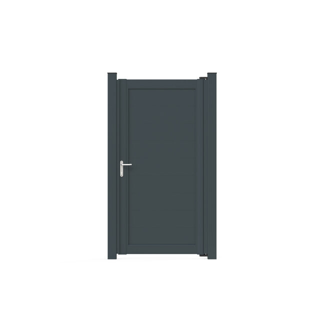 Aluminium poort met horizontale brede tandgroef vulling | Mooie tuinpoort van aluminium. Complete poort incl. vleugel, poortpalen, scharnieren en slot. Lees meer.
